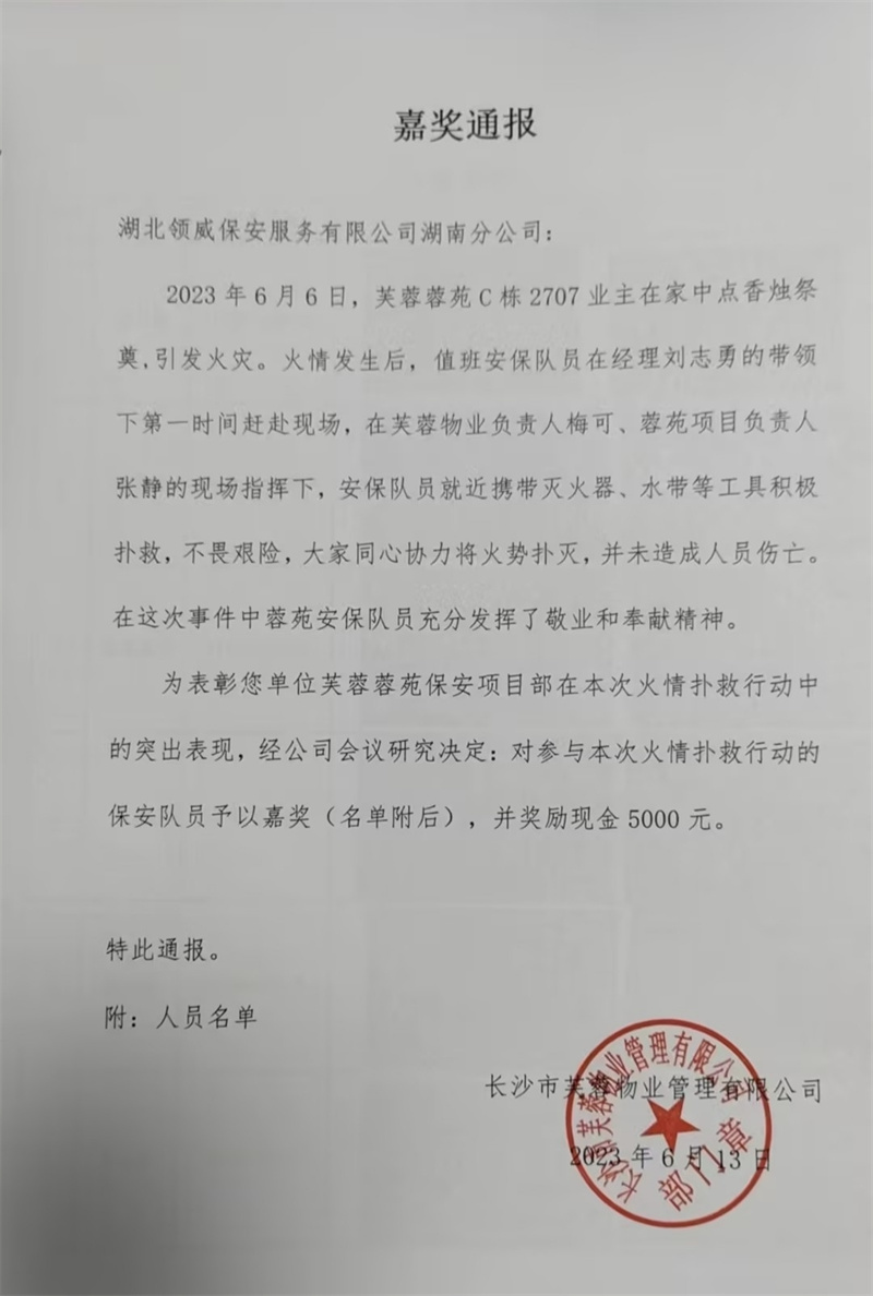 客戶單位長(zhǎng)沙市芙蓉物業(yè)公司對(duì)此次事件中參與救火的安保隊(duì)員們的敬業(yè)奉獻(xiàn)精神給予了高度的評(píng)價(jià)及贊賞,并發(fā)布表?yè)P(yáng)通告獎(jiǎng)勵(lì)現(xiàn)金5000元,以此來(lái)肯定隊(duì)員們的突出表現(xiàn)。