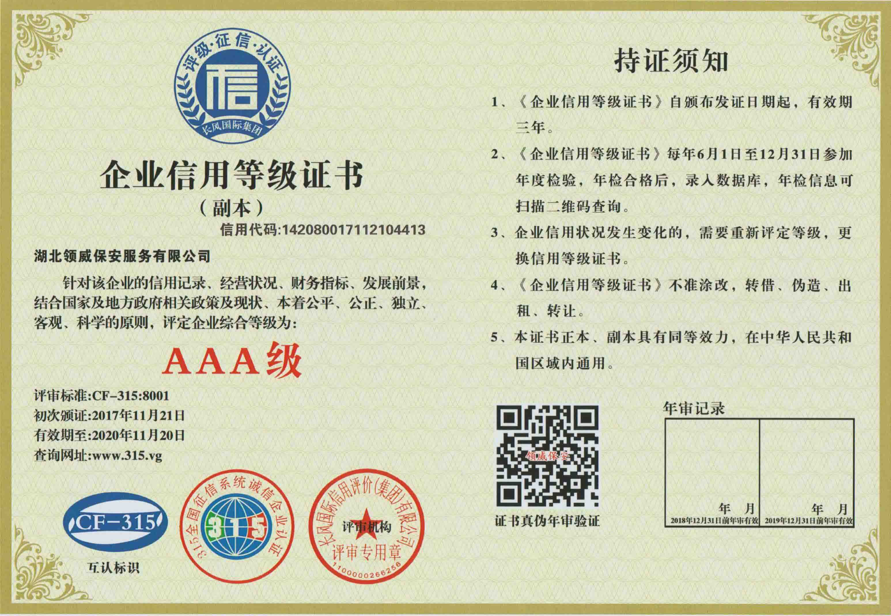 11月21日,湖北領(lǐng)威保安服務(wù)有限公司一次性順利通過了國家3A級信用等級、國家3A重合同守信用企業(yè)、國家3A級質(zhì)量服務(wù)信譽企業(yè)、國家3A級資信等級、國家3A級誠信經(jīng)營示范單位共5項企業(yè)認(rèn)證。